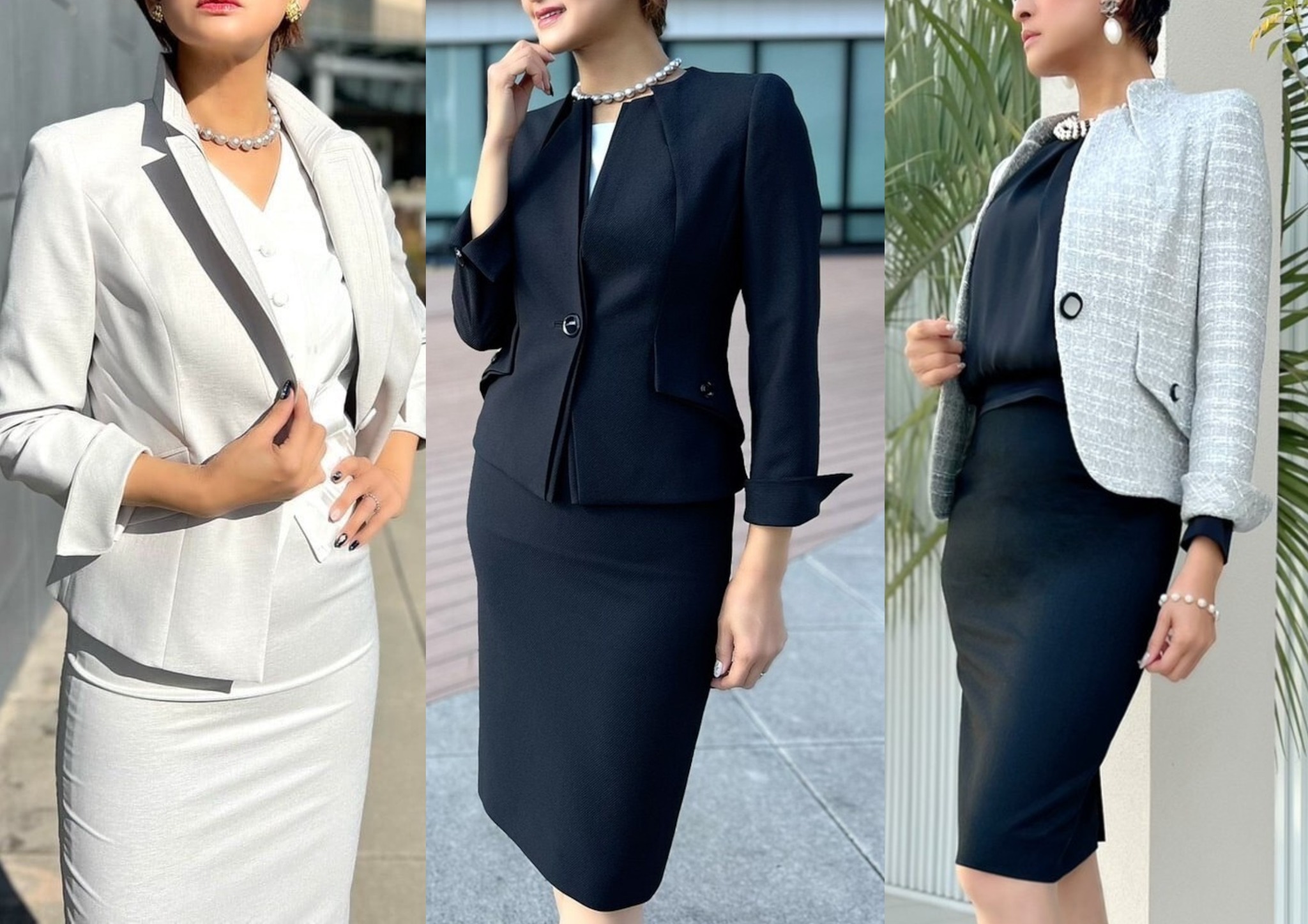ネイビー、グレー、ベージュの3色は、女性経営者に欠かせない「安定感」を演出します。