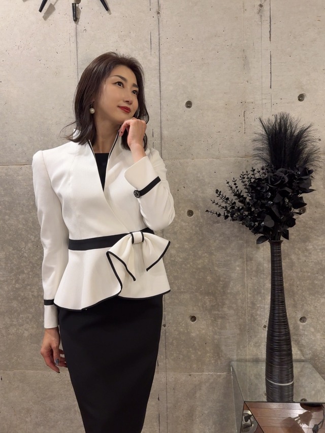 AUTUMN/WINTER 【ファビュラスリボンスーツ】 「知的でありながら、女性らしく華やかに」 そんな願いを叶える、ドレス仕立てのスーツ 纏うことで、自分らしさが一層際立つ 「スーツは堅い」そんな固定概念を超えて 一歩先のエレガンスを纏えば、 ビジネスの場でもあなたらしい輝きが生まれる 【お客様の声】 仕事柄スーツを着ますが、普段は堅めのものばかり。 いつもと違った甘さのあるこのスーツが気になりました。 こちらのスーツは白黒カラーなので、リボンモチーフなのに甘すぎない絶妙なバランス。 華やかな場所にも着ていけるのでとても重宝しています。 ジャケット *裏地仕様:身頃 総裏 袖 裏あり *ウエスト部分飾りリボンあり *黒無地胸当てあり *リボンスナップ留め スカート *黒無地生地 *裏地あり *後中心ファスナー開き *後中心ベンツ開き SIZE 38/40 /42 JACKET サイズ 38号 40号 42号 肩巾 35.6cm 36.6cm 37.6cm 着丈 55cm 56cm 56.5cm バスト 94cm 99cm 104cm ウエスト 79cm 84cm 89cm 袖丈 59cm 59.5cm 59.5cm SKIRTサイズ 38号 40号 42号 丈 62cm 63cm 63cm ウエスト 68cm 73cm 78cm ヒップ 93cm 98cm 103cm 色展開 オフ白ジャケット×黒胸当て×黒スカート 表素材 ポリエステル98% ポリウレタン2% 別生地 ポリエステル100% 裏 地 ポリエステル100%