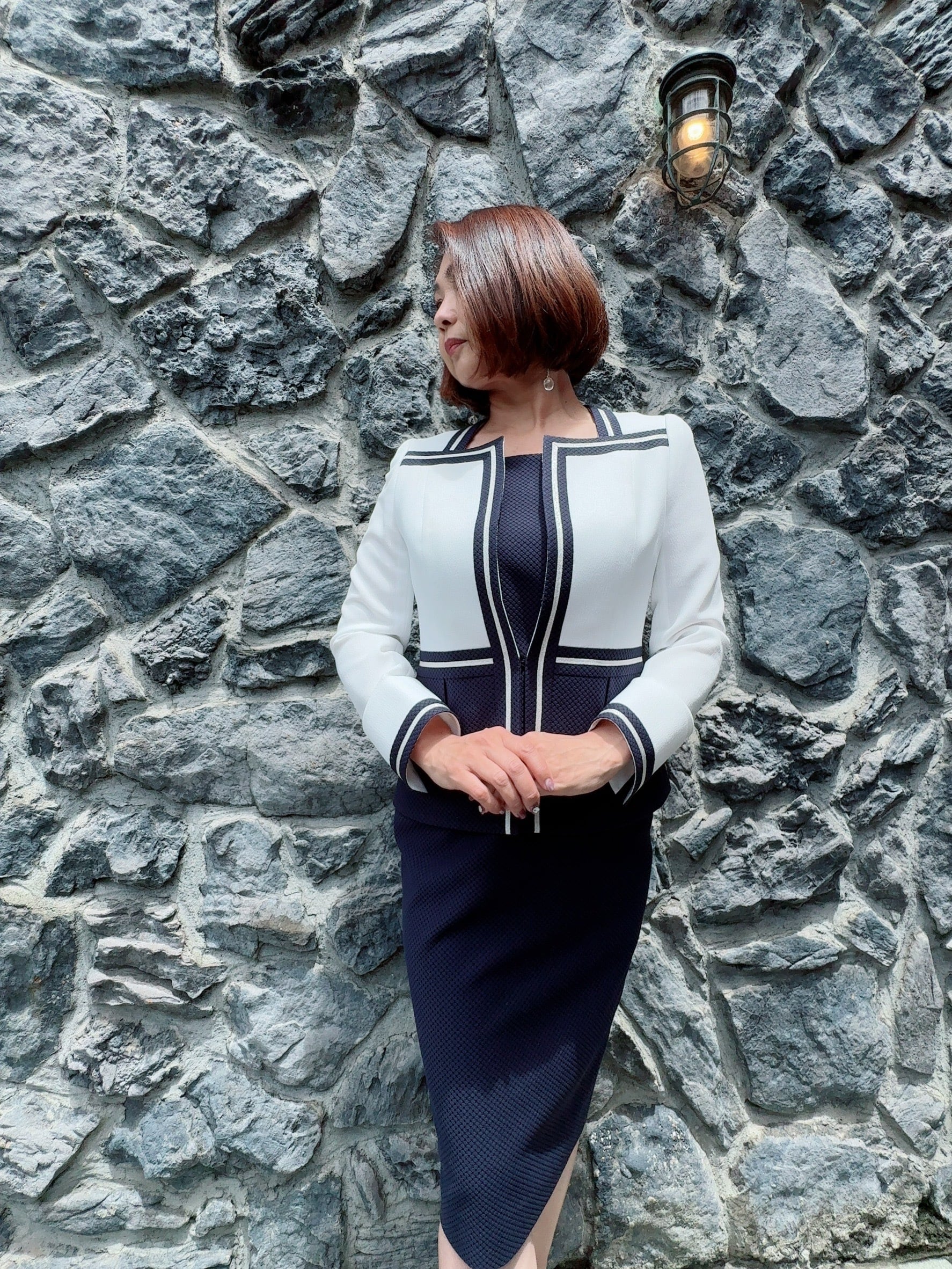 色展開 オフ白ジャケット×濃紺胸当て×濃紺スカート