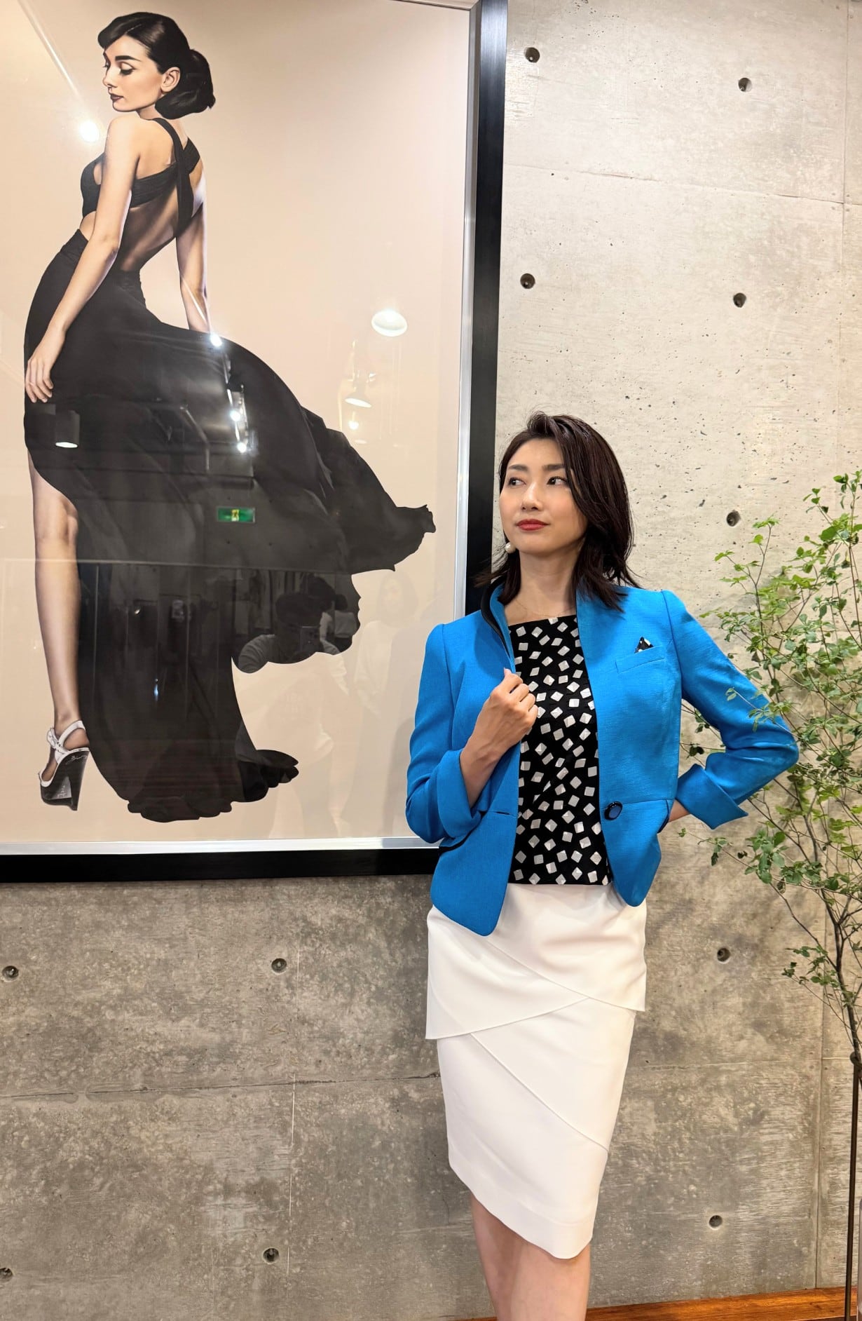 ブルージャケットⅹ黒白プリントブラウスxオフ白スカート