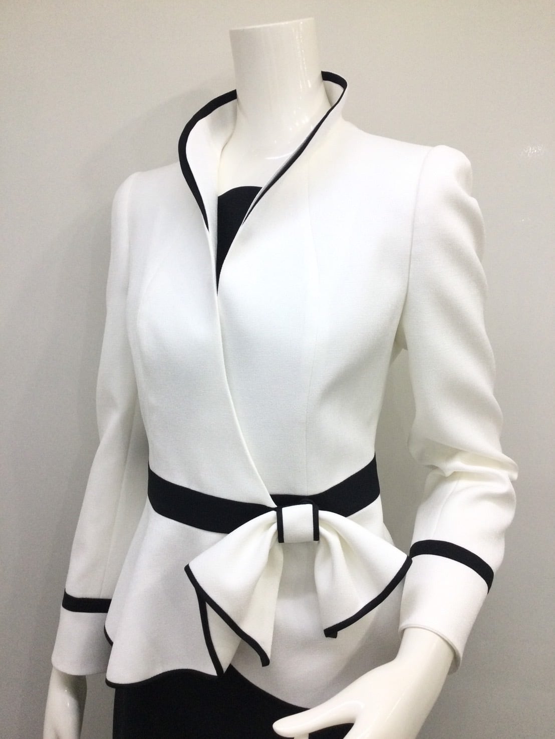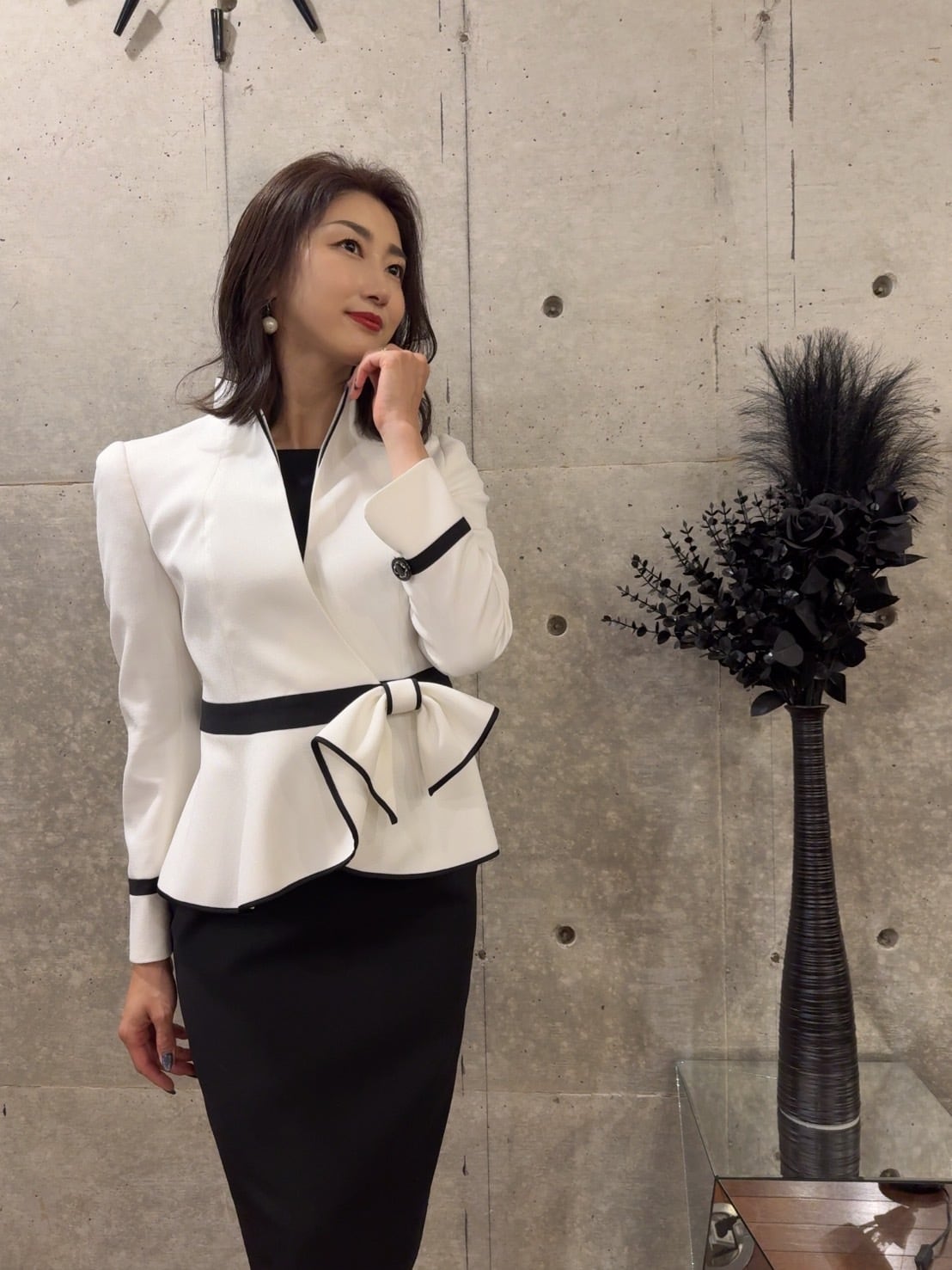 こちらのスーツは白黒カラーなので、リボンモチーフなのに甘すぎない絶妙なバランス。