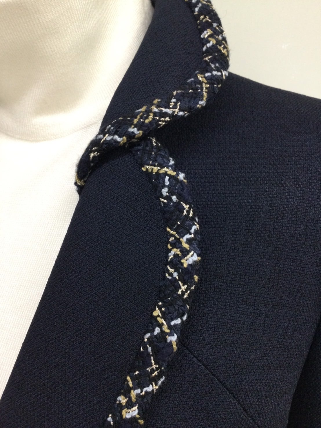 *衿周り ラペル~前端~裾 フラップ周り 袖口ツィードトリミングあり