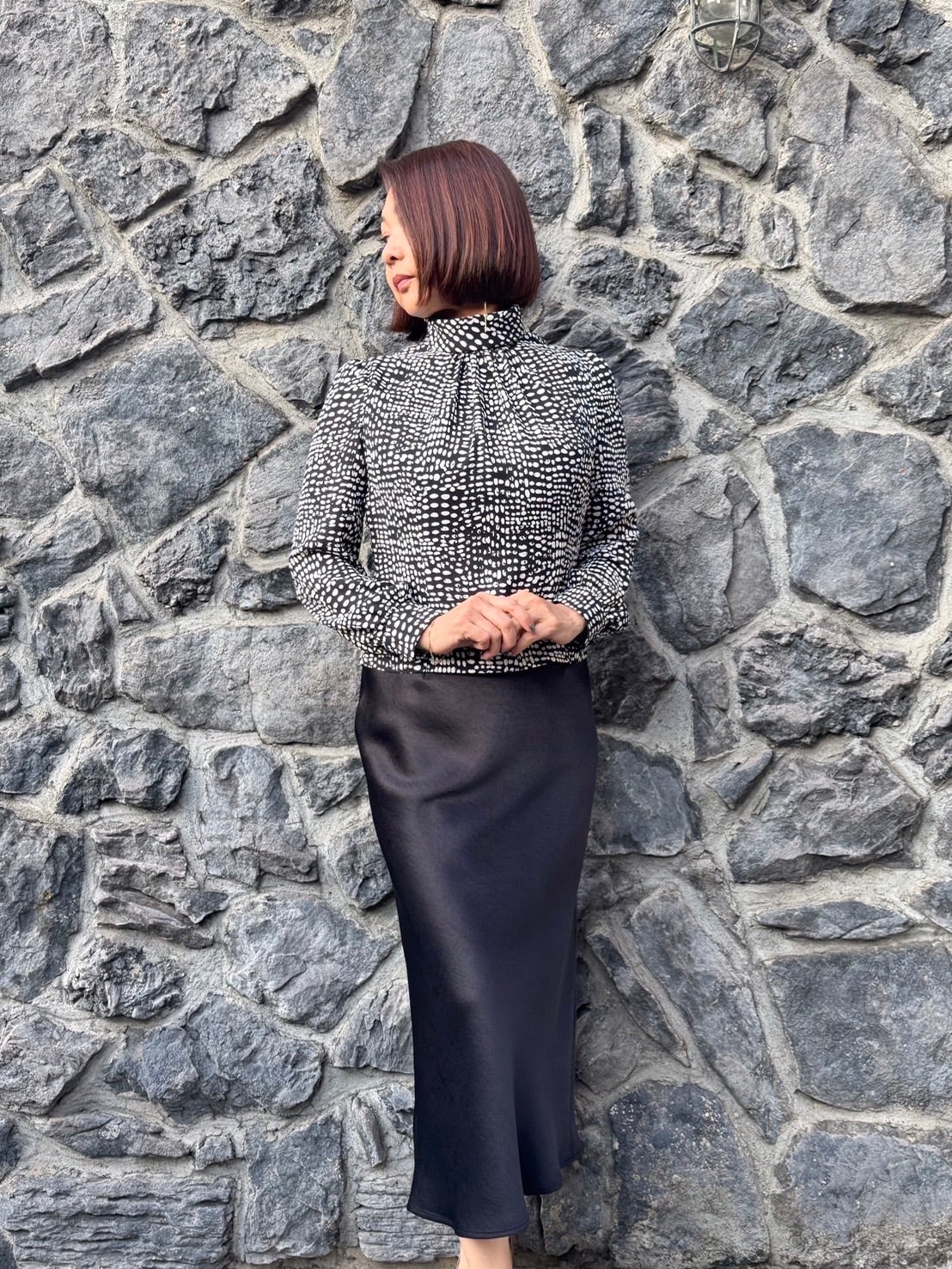 オフ白ジャケットx白黒ブラウスx黒スカート