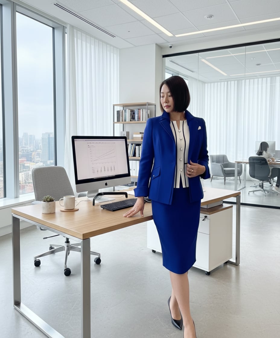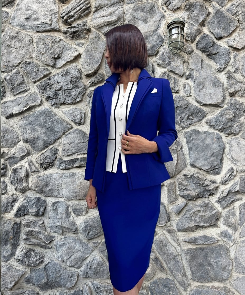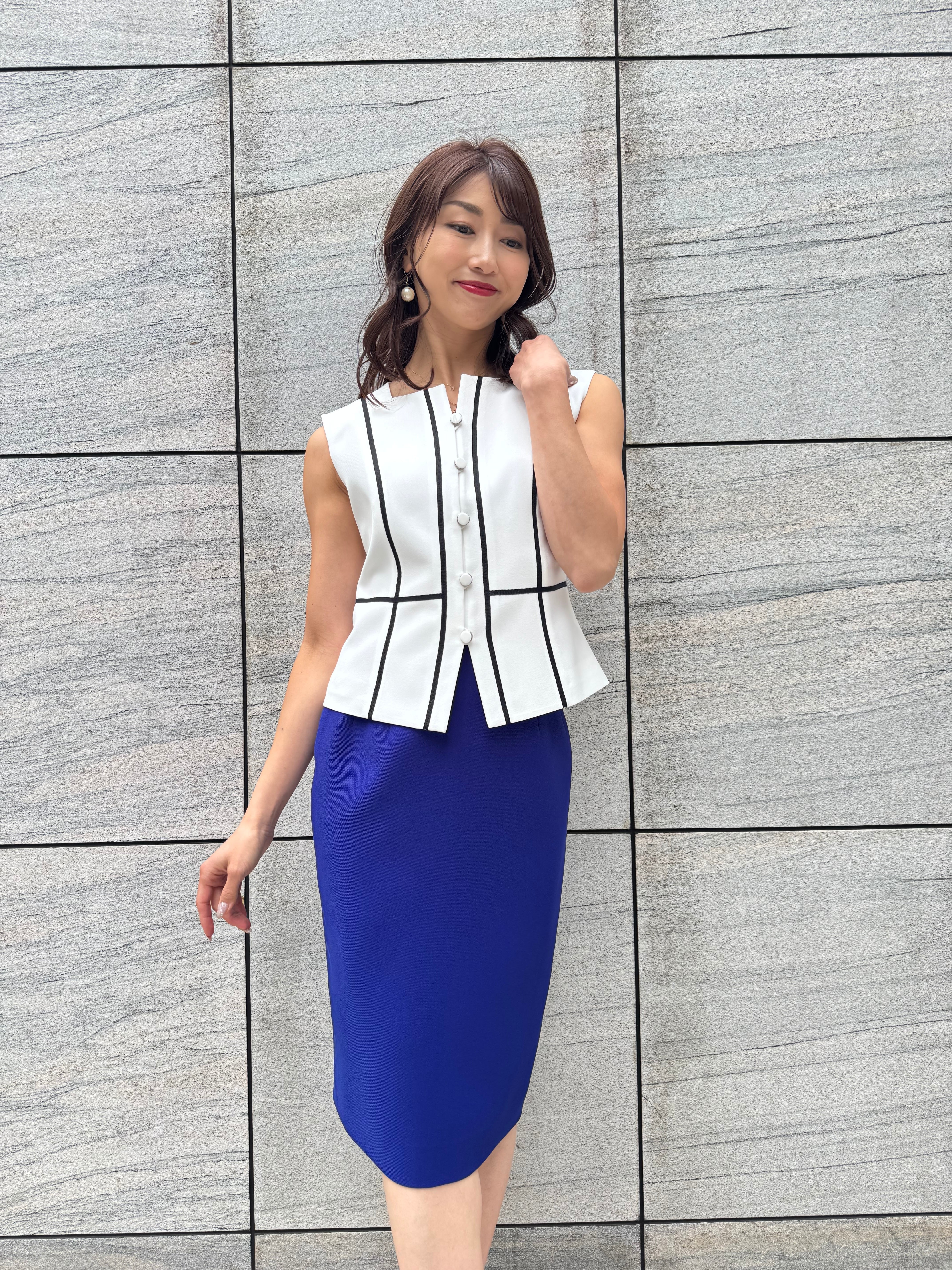 ロイヤルブルージャケットxオフ白ジレxロイヤルブルースカート