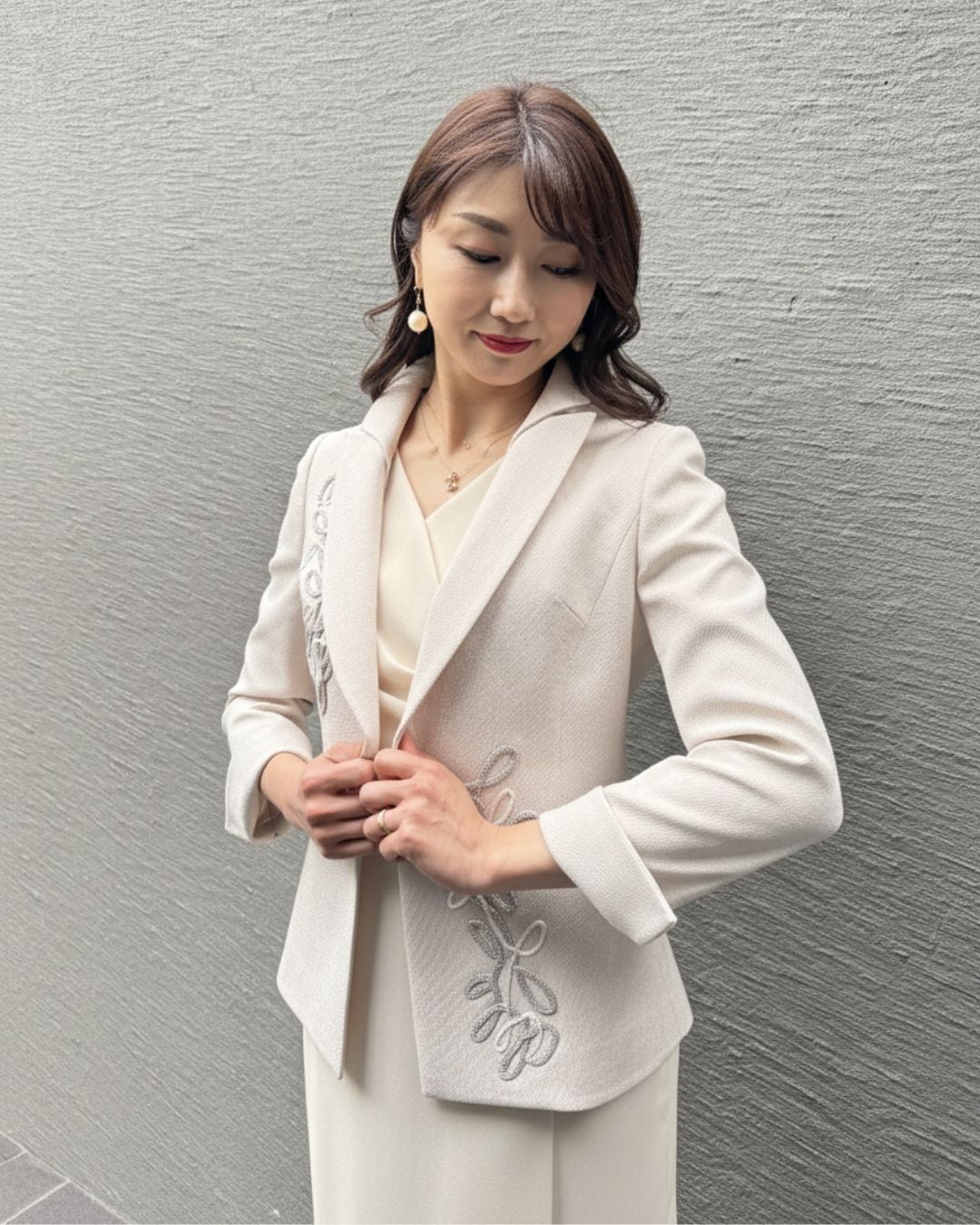 それは、計算されたシルエットと繊細なコード刺繍が生み出す