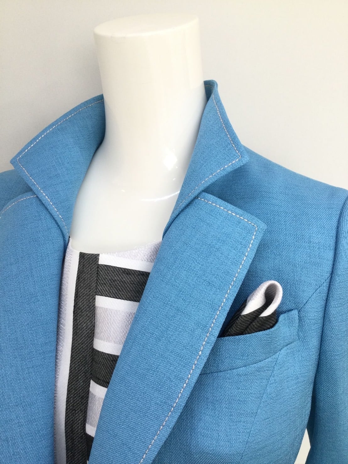*衿周り ラペル周り フラップ 袖口にシルバーステッチ