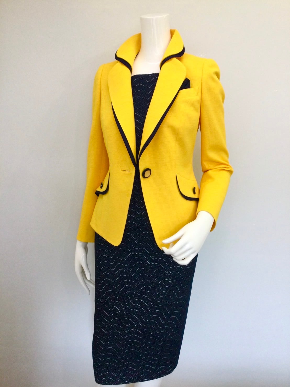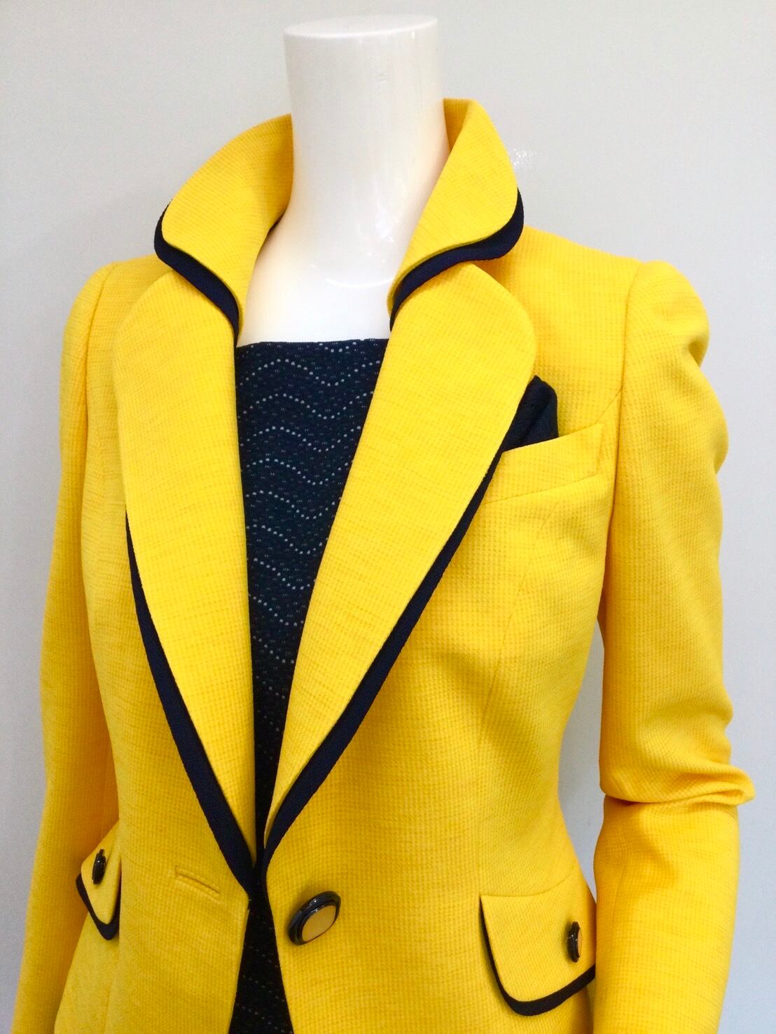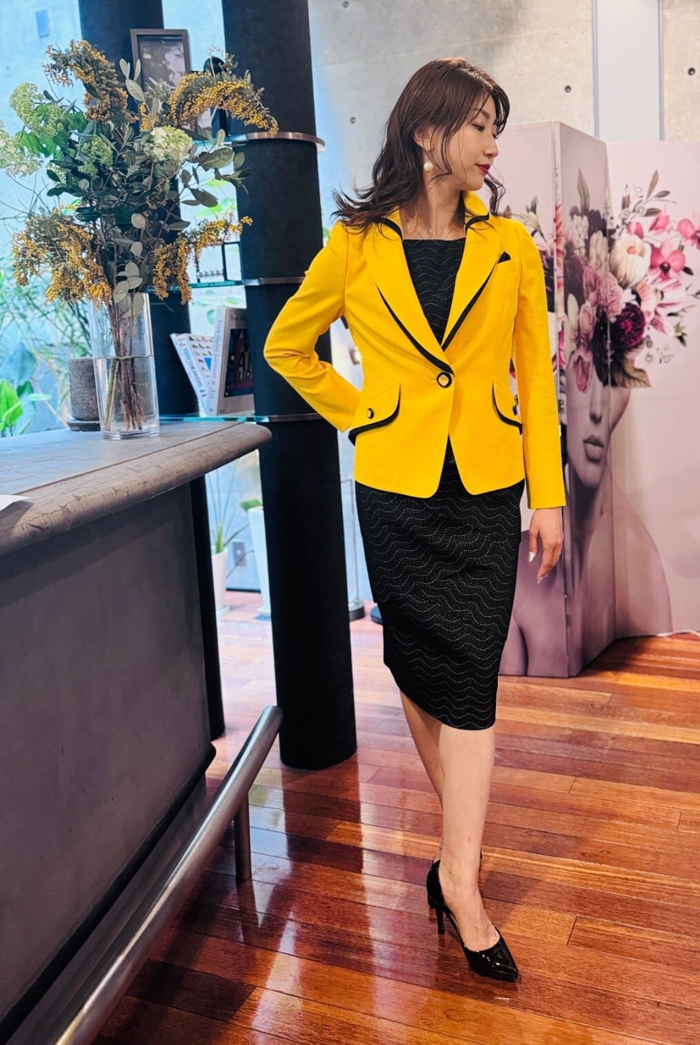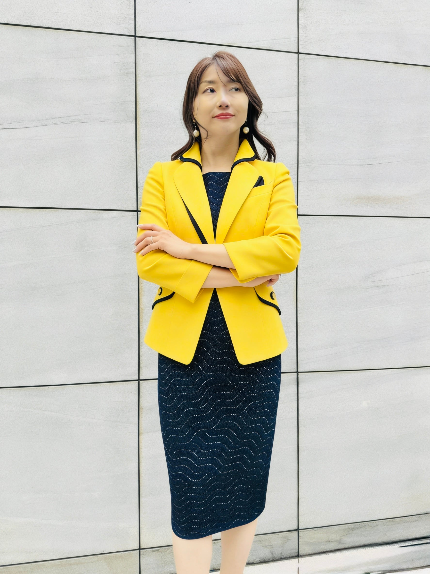 イエロージャケットx濃紺ブラウスx濃紺スカート